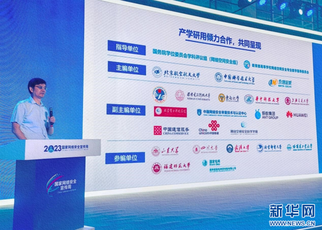 教育部高等學(xué)校網(wǎng)絡(luò)空間安全專業(yè)教學(xué)指導(dǎo)委員會(huì)副主任委員、中國(guó)科學(xué)技術(shù)大學(xué)網(wǎng)絡(luò)安全學(xué)院執(zhí)行院長(zhǎng)俞能海在現(xiàn)場(chǎng)發(fā)布白皮書。新華網(wǎng)發(fā)(主辦方供圖)