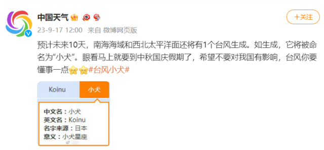 央視網(wǎng)消息:據(jù)@中國(guó)天氣 微博消息,預(yù)計(jì)未來(lái)10天,南海海域和西北太平洋面還將有1個(gè)臺(tái)風(fēng)生成。如生成,它將被命名為“小犬”。