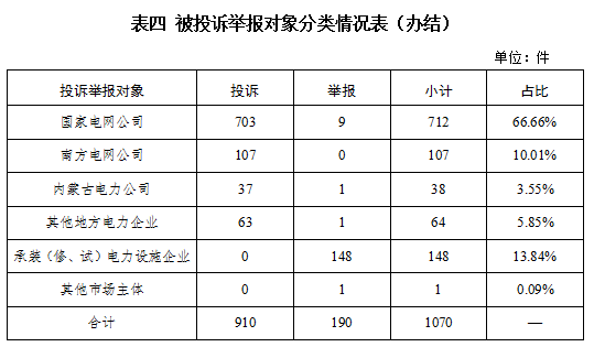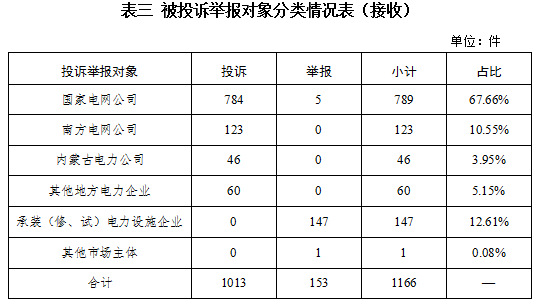 從被投訴舉報對象看,供電企業(yè)921件、占投訴舉報總數(shù)的86.07%,其中國家電網(wǎng)公司712件、占比66.66%,南方電網(wǎng)公司107件、占比10.01%,內(nèi)蒙古電力公司38件、占比3.55%,其他地方電力企業(yè)64件、占比5.85%;承裝(修、試)電力設(shè)施企業(yè)148件、占比13.84%;其他市場主體1件、占比0.09%。