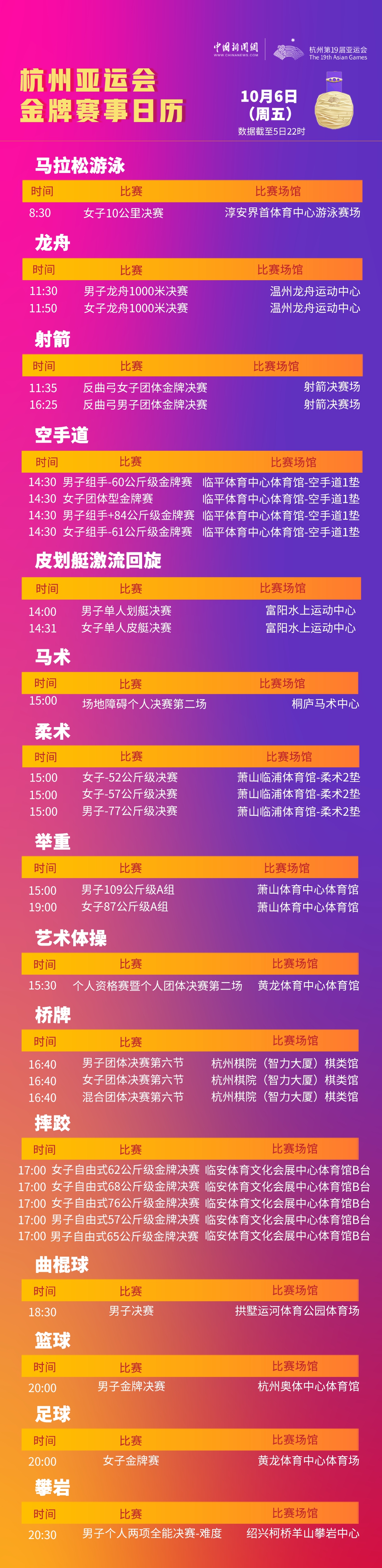 中新網(wǎng)10月6日電 6日,杭州亞運會迎來倒數(shù)第3個比賽日,將產(chǎn)生30枚金牌。中國選手在舉重、皮劃艇、龍舟、橋牌等項目上具備沖金實力。首次進入亞運會的霹靂舞項目也在今日開賽。
