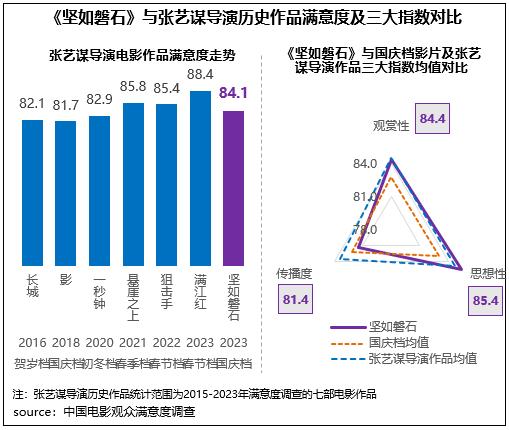 張藝謀導演新作《堅如磐石》獲得觀眾滿意度評分84.1分,居2023年國慶檔調(diào)查五部影片首位,也是檔期內(nèi)唯一一部滿意度超84分的影片,保持了張藝謀導演系列電影作品的高滿意度水平。