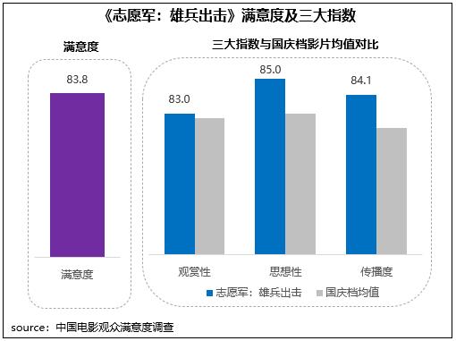 陳凱歌執(zhí)導的抗美援朝題材影片《志愿軍:雄兵出擊》觀眾滿意度83.8分,與檔期第一名分差僅0.3分。