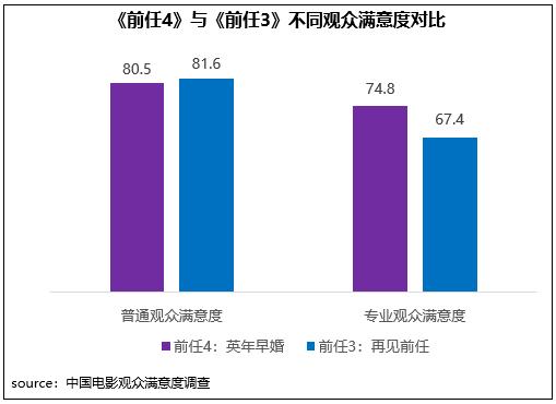 《前任4:英年早婚》在同系列影片輕松、寫實創(chuàng)作風格基礎(chǔ)上,進階到婚姻話題探討,并進一步強化對觀眾現(xiàn)實情感生活的細致洞察,成為當代人的愛情圖鑒。在不同觀眾評價中,影片相對更受專業(yè)觀眾的青睞,專業(yè)觀眾滿意度得分74.8分,高于上一部作品7.4分,其中精彩對白、傳播方式得分居檔期第二和第三位;但普通觀眾對其評價一般,滿意度得分80.5分,比上一部低1.1分。