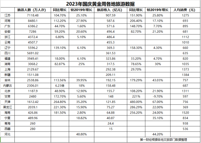 第一財(cái)經(jīng)梳理發(fā)現(xiàn),今年五一假期,在旅游人數(shù)超過(guò)3000萬(wàn)人次的旅游大省中,跟疫情前相比僅云南人均消費(fèi)出現(xiàn)增長(zhǎng),包括河南、四川、廣東、江蘇和浙江的人均消費(fèi)相比2019年“五一”節(jié)都是下降的。但是,今年國(guó)慶期間,多數(shù)省份旅游收入的增幅高于旅游人數(shù)的增幅。