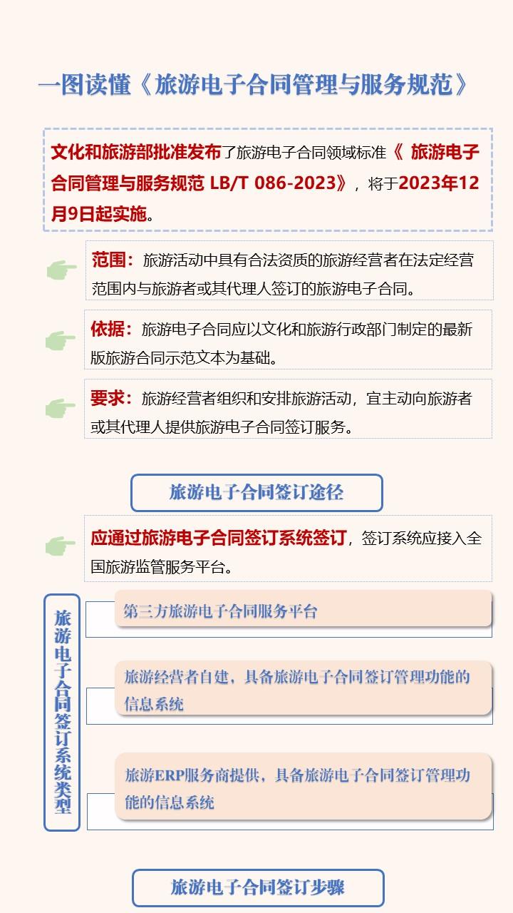 日前,文化和旅游部批準(zhǔn)發(fā)布了旅游電子合同領(lǐng)域的行業(yè)標(biāo)準(zhǔn)《旅游電子合同管理與服務(wù)規(guī)范》(以下簡(jiǎn)稱“標(biāo)準(zhǔn)”),將于2023年12月9日起實(shí)施。文化和旅游部今天正式發(fā)布該規(guī)范的解讀。
