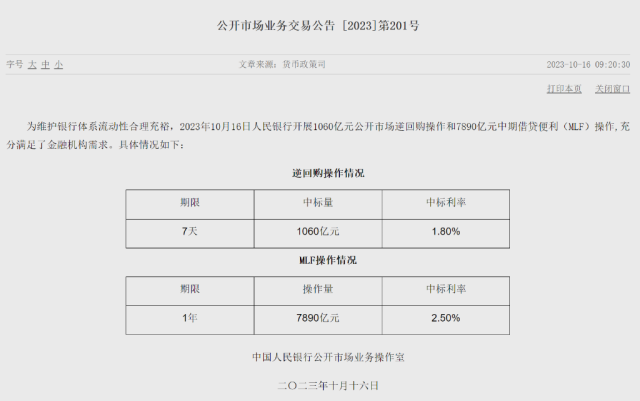 為維護(hù)銀行體系流動性合理充裕,10月16日中國人民銀行開展1060億元公開市場逆回購操作和7890億元中期借貸便利(MLF)操作,充分滿足了金融機(jī)構(gòu)需求。