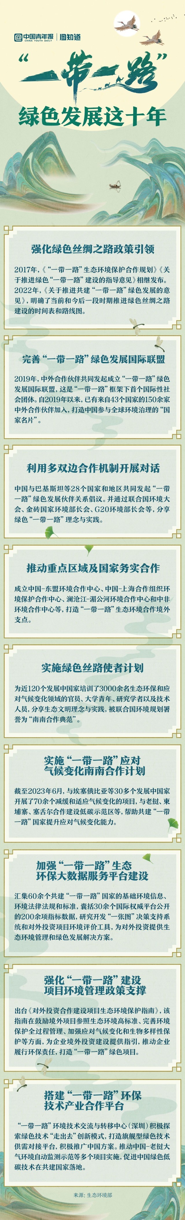 綠色已成為共建“一帶一路”鮮明底色。十年來,綠色絲綢之路建設(shè)為全球環(huán)境與氣候治理不斷貢獻(xiàn)力量。中國實施的綠色絲路使者計劃為近120個發(fā)展中國家培訓(xùn)了3000余名生態(tài)環(huán)保和應(yīng)對氣候變化領(lǐng)域的大學(xué)青年、技術(shù)人員等,許多年輕人成為綠色絲路使者,為共建“一帶一路”國家落實聯(lián)合國2030年可持續(xù)發(fā)展議程提供方案,接力下一個十年。