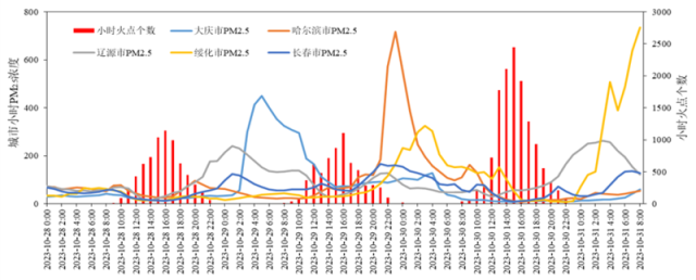 10月28日0時-31日8時,哈爾濱及周邊城市PM2.5濃度以及東北40城市秸稈焚燒小時火點個數(shù)變化情況。