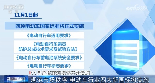11月1日起,四項電動車國家標(biāo)準(zhǔn)將正式實(shí)施,分別是《電動自行車通用要求》《電動自行車乘員防護(hù)總成技術(shù)要求及試驗方法》《電動自行車蓄電池系統(tǒng)安全要求》以及《電動自行車標(biāo)志要求》。這些標(biāo)準(zhǔn)對電動車的設(shè)計制造、安全性能、電池系統(tǒng)和標(biāo)識等方面都提出了明確規(guī)定,涉及電動車的車把、鋰電池、總線設(shè)計、電子控制系統(tǒng)等。