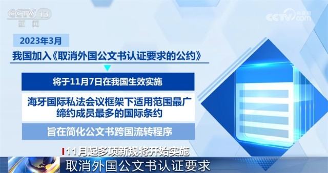 今年3月,我國加入《取消外國公文書認(rèn)證要求的公約》,《公約》將于11月7日在我國生效實(shí)施?!豆s》是海牙國際私法會議框架下適用范圍最廣、締約成員最多的國際條約,旨在簡化公文書跨國流轉(zhuǎn)程序。11月7日起,中國送往其他締約國使用的公文書僅需辦理《公約》規(guī)定的附加證明書,即可送其他締約國使用,無需辦理中國和締約國駐華使領(lǐng)館的領(lǐng)事認(rèn)證。其他締約國公文書送中國內(nèi)地使用,只需辦理該國附加證明書,無需辦理該國和中國駐當(dāng)?shù)厥诡I(lǐng)館的領(lǐng)事認(rèn)證。