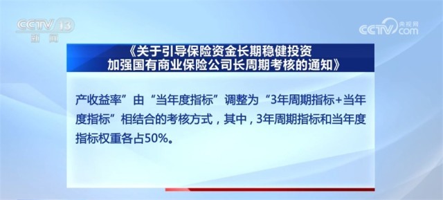 《通知》明確,為引導國有商業(yè)保險公司長期穩(wěn)健經(jīng)營,更好發(fā)揮中長期資金的市場穩(wěn)定器和經(jīng)濟發(fā)展助推器作用,加強對國有商業(yè)保險公司的長周期考核,根據(jù)《財政部關(guān)于印發(fā)<商業(yè)保險公司績效評價辦法>的通知》,將經(jīng)營效益指標的“凈資產(chǎn)收益率”由“當年度指標”調(diào)整為“3年周期指標+當年度指標”相結(jié)合的考核方式,其中,3年周期指標和當年度指標權(quán)重各占50%。