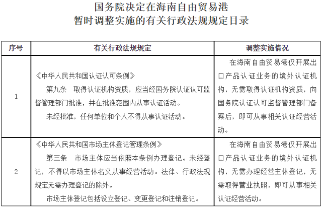 一、為支持海南自由貿(mào)易港建設(shè),按照《海南自由貿(mào)易港建設(shè)總體方案》,同意自即日起在海南自由貿(mào)易港暫時調(diào)整實(shí)施《中華人民共和國認(rèn)證認(rèn)可條例》《中華人民共和國市場主體登記管理?xiàng)l例》有關(guān)規(guī)定(目錄附后),在海南自由貿(mào)易港僅開展出口產(chǎn)品認(rèn)證業(yè)務(wù)的境外認(rèn)證機(jī)構(gòu),無需取得認(rèn)證機(jī)構(gòu)資質(zhì)和辦理經(jīng)營主體登記,向國務(wù)院認(rèn)證認(rèn)可監(jiān)督管理部門備案后,即可開展出口產(chǎn)品認(rèn)證業(yè)務(wù),認(rèn)證結(jié)果僅限出口企業(yè)境外使用。備案條件和程序由國務(wù)院認(rèn)證認(rèn)可監(jiān)督管理部門制定。