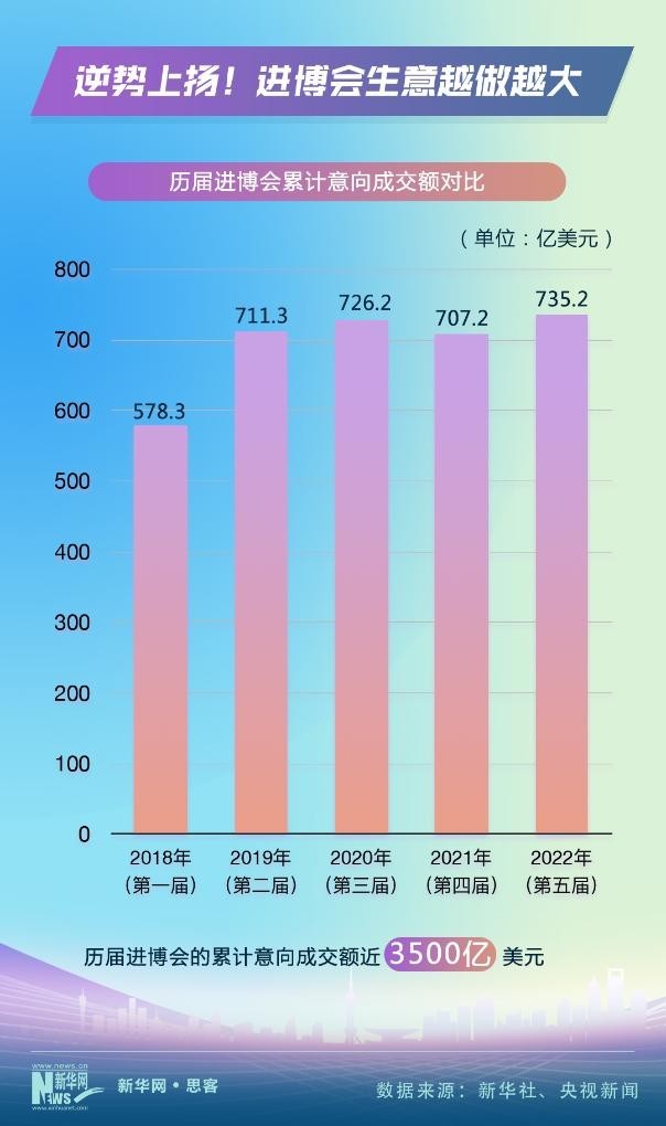 2018年11月,首屆進(jìn)博會(huì)在上?!俺踉囂渎暋?。之后,進(jìn)博會(huì)不顧風(fēng)雨和險(xiǎn)阻,年年如約而至、越辦越好。數(shù)據(jù)顯示,進(jìn)博會(huì)的累計(jì)意向成交額從2018年的578.3億美元,上升到2022年的735.2億美元。前五屆進(jìn)博會(huì)的累計(jì)意向成交額近3500億美元。進(jìn)博會(huì)生意越做越大。