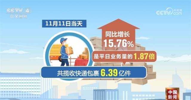 數(shù)據顯示,11月1日至11日,全國郵政快遞企業(yè)共攬收快遞包裹52.64億件,同比增長23.22%,日均業(yè)務量是平日業(yè)務量的1.4倍。其中11月11日當天,共攬收快遞包裹6.39億件,是平日業(yè)務量的1.87倍,同比增長15.76%。
