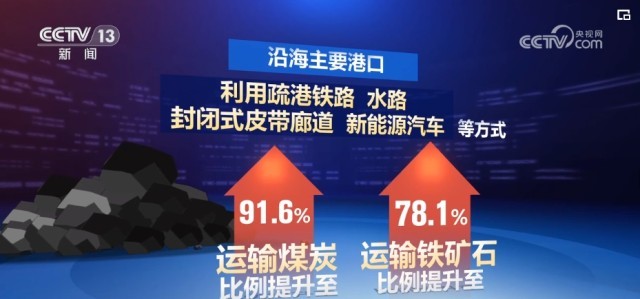 貨物“公轉(zhuǎn)鐵”“公轉(zhuǎn)水”深入推進(jìn),沿海主要港口利用疏港鐵路、水路、封閉式皮帶廊道、新能源汽車等方式運輸煤炭、鐵礦石的比例提升至91.6%和78.1%。