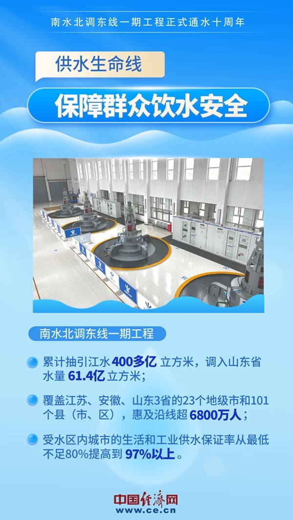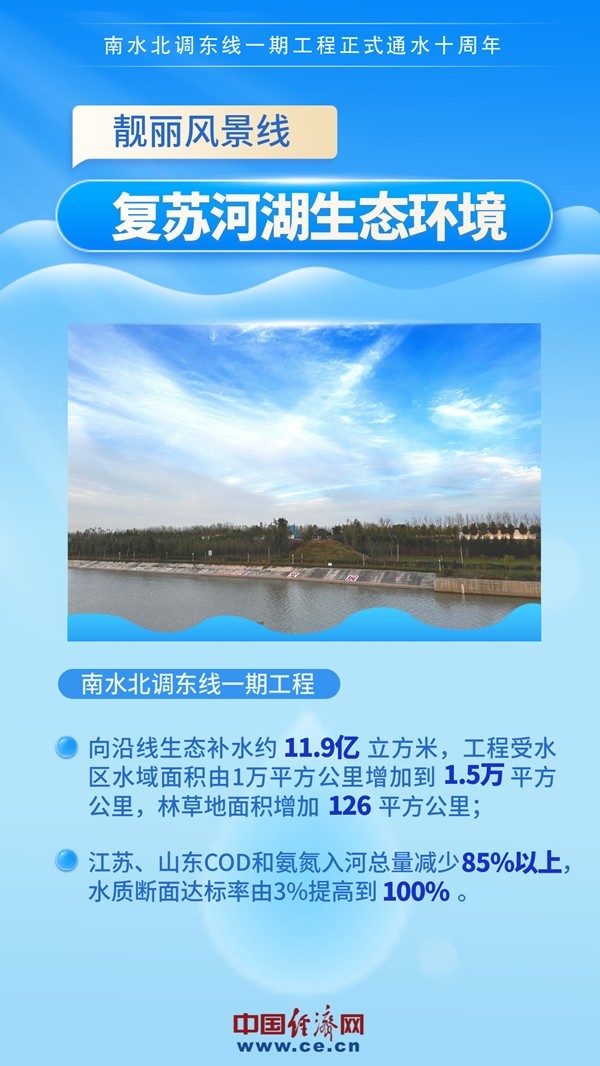 2013年11月15日,南水北調(diào)東線一期工程正式通水。通水10年來,東線一期工程累計抽引江水400多億立方米,調(diào)入山東省水量61.4億立方米,有效緩解了南水北調(diào)東線沿線受水區(qū)缺水問題,受益人口超6800萬人,成為優(yōu)化水資源配置、保障群眾飲水安全、復(fù)蘇河湖生態(tài)環(huán)境、暢通南北經(jīng)濟循環(huán)的生命線。