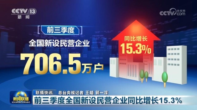 另外,市場監(jiān)管總局今天公布數(shù)據(jù)顯示,前三季度,全國新設(shè)民營企業(yè)706.5萬戶,同比增長15.3%。截至今年9月底,全國登記在冊民營企業(yè)數(shù)量超過5200萬戶,民營企業(yè)在企業(yè)總量中的占比達到92.3%。