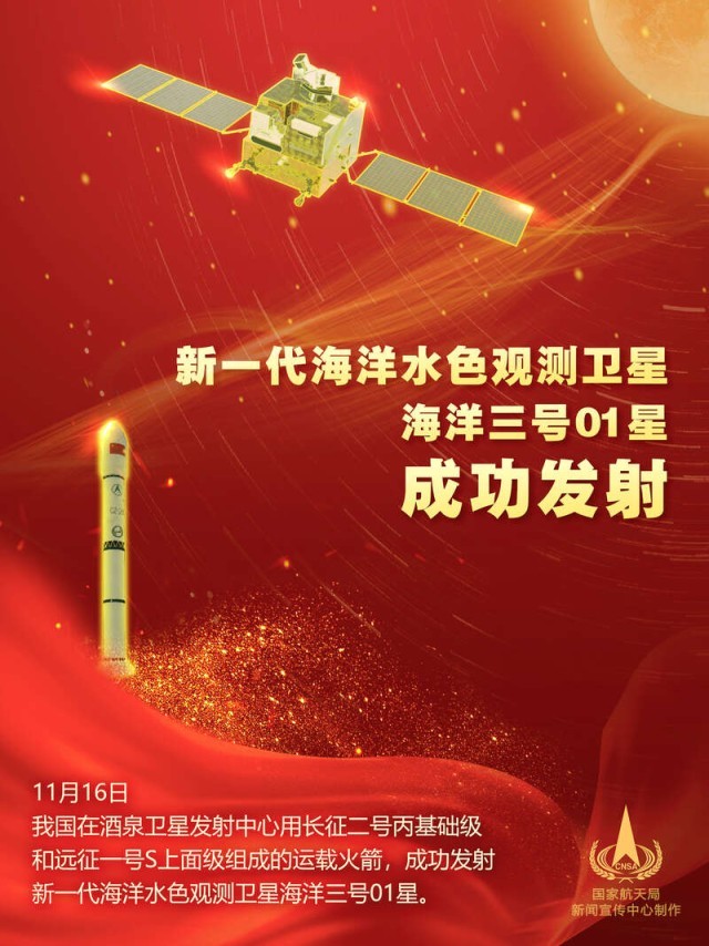 中國青年報客戶端北京11月16日電(張未 王豪 李儀 中青報·中青網(wǎng)記者 邱晨輝)北京時間11月16日11時55分,我國在酒泉衛(wèi)星發(fā)射中心用長征二號丙基礎(chǔ)級和遠征一號S上面級組成的運載火箭,成功發(fā)射新一代海洋水色觀測衛(wèi)星海洋三號01星。該衛(wèi)星指標達到國際水色遙感衛(wèi)星先進水平,可滿足我國海洋環(huán)境監(jiān)測的主體業(yè)務(wù)需求,并能夠服務(wù)于生態(tài)文明建設(shè)、智慧海洋工程建設(shè)、“一帶一路”倡議等國家重大戰(zhàn)略需求。