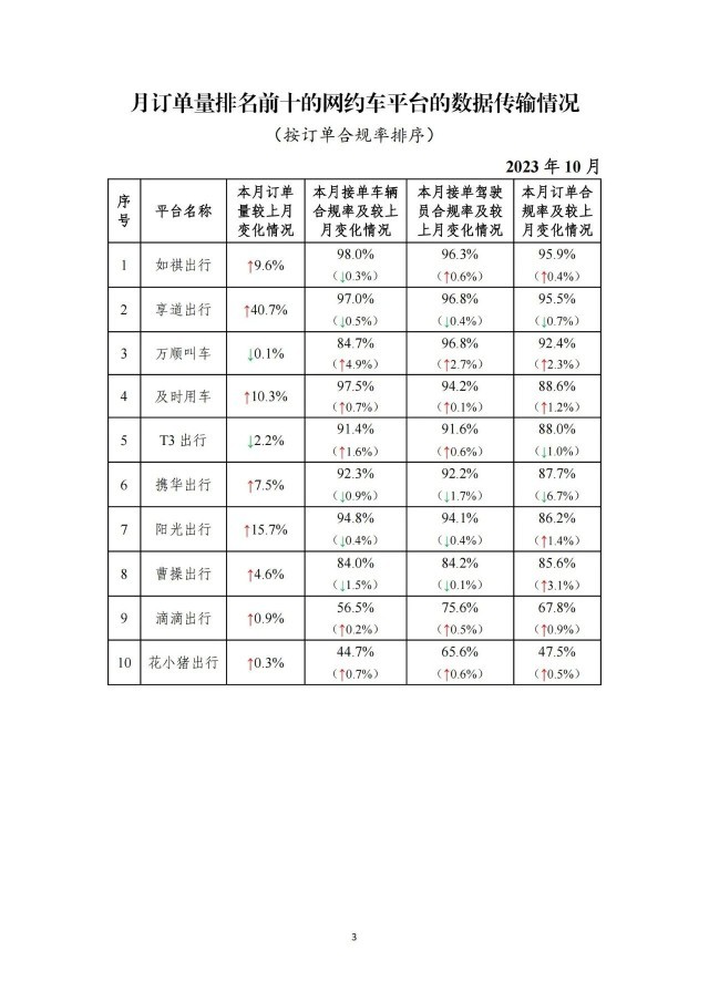 一、在訂單量前10名的網(wǎng)約車平臺中,訂單合規(guī)率最高的是如祺出行,最低的是花小豬出行。在訂單量前10名的平臺中,按訂單合規(guī)率(指駕駛員和車輛均獲得許可的訂單量占比)從高到低的分別是如祺出行、享道出行、萬順叫車、及時用車、T3出行、攜華出行、陽光出行、曹操出行、滴滴出行、花小豬出行。本月訂單合規(guī)率增長前3名的依次是曹操出行、萬順叫車、陽光出行;增長最后3名的依次是享道出行(-0.7%)、T3出行(-1.0%)、攜華出行(-6.7%)。