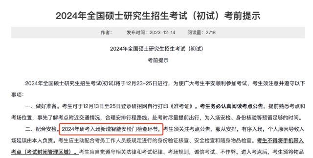 記者注意到,近日,多地發(fā)布2024考研須知。其中,黑龍江省、遼寧省、河南省等地明確,今年研考入場新增智能安檢門檢查環(huán)節(jié)。