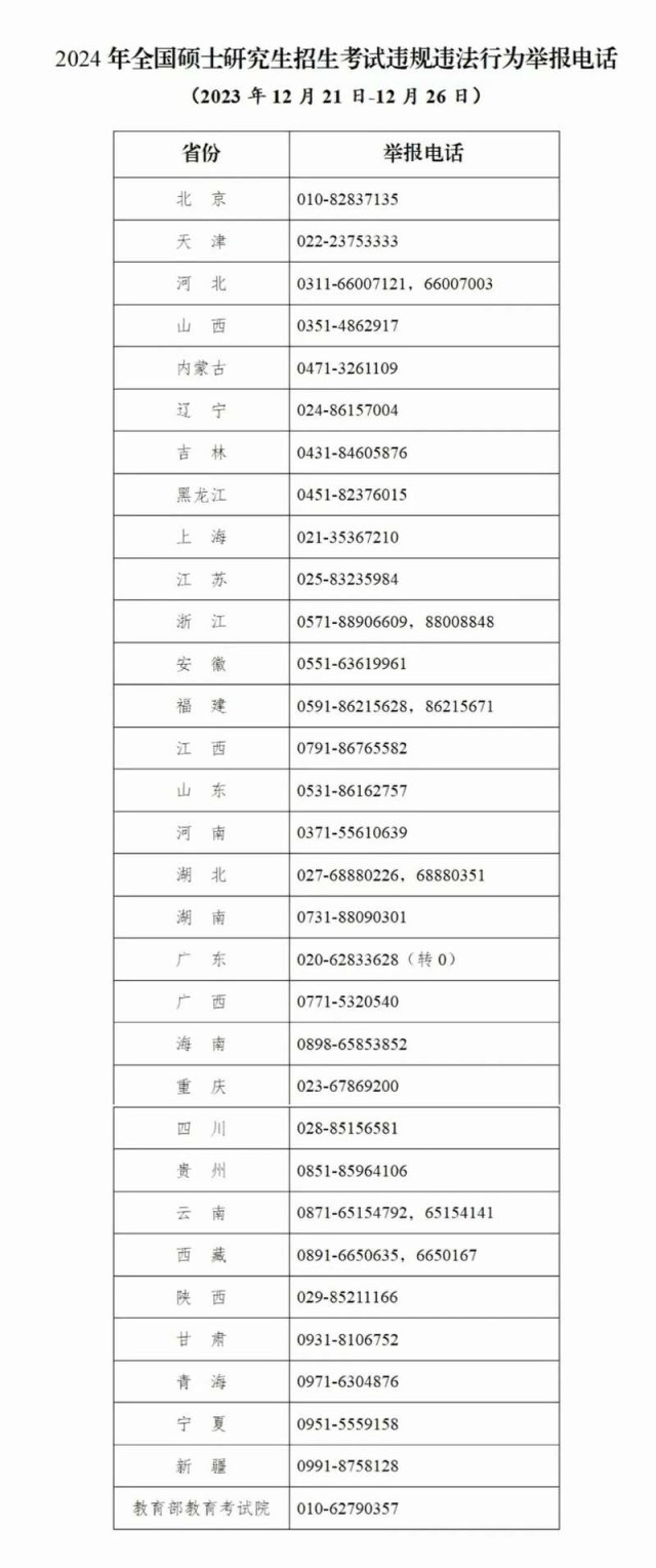 教育部和各?。▍^(qū)、市)教育招生考試機構(gòu)將開通2024年研考舉報電話,考生及社會各界人士可及時舉報反映有關(guān)問題線索。教育部及各省(區(qū)、市)將會同有關(guān)部門根據(jù)舉報線索第一時間核查處理,堅決維護風(fēng)清氣正的研考環(huán)境。