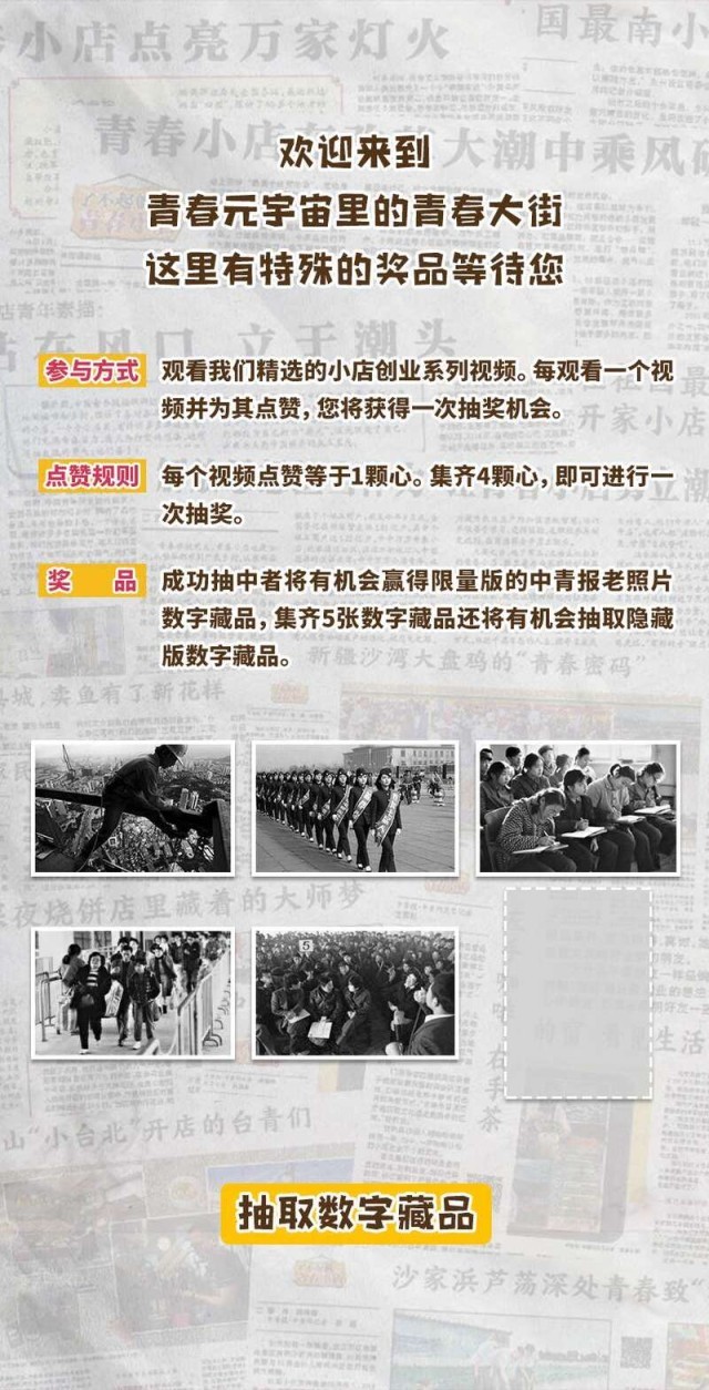 奔跑在青春大街上的青小豹邀請讀者一起玩尋找小店的游戲,大家可以邊體驗邊觀看一個個小店和店主的故事,參加愛心點贊,還可以參與抽獎。獎品是用區(qū)塊鏈技術(shù)創(chuàng)制的數(shù)字藏品——改革開放45年以來中國青年報拍攝的精彩照片。