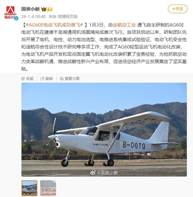 央視網(wǎng)消息:據(jù)@國(guó)資小新 消息,1月3日,由@航空工業(yè) 通飛自主研制的AG60E電動(dòng)飛機(jī)在建德千島湖通用機(jī)場(chǎng)圓滿完成首次飛行。自項(xiàng)目啟動(dòng)以來(lái),研制團(tuán)隊(duì)先后開展了電機(jī)、電控、動(dòng)力電池選型、電推進(jìn)系統(tǒng)集成試驗(yàn)驗(yàn)證、電動(dòng)飛機(jī)安全性和適航符合性設(shè)計(jì)技術(shù)研究等多項(xiàng)工作,完成了AG60輕型運(yùn)動(dòng)飛機(jī)電動(dòng)化改裝,為電動(dòng)飛機(jī)產(chǎn)品開發(fā)和現(xiàn)役固定翼飛機(jī)電動(dòng)化改裝積累了寶貴經(jīng)驗(yàn),為搶抓航空動(dòng)力變革戰(zhàn)略機(jī)遇,推進(jìn)戰(zhàn)略性新興產(chǎn)業(yè)布局,促進(jìn)低空經(jīng)濟(jì)產(chǎn)業(yè)發(fā)展奠定了堅(jiān)實(shí)基礎(chǔ)。