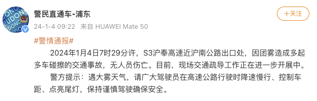 央視網(wǎng)消息:據(jù)警民直通車(chē)-浦東通報(bào),1月4日7時(shí)29分許,S3滬奉高速近滬南公路出口處,因團(tuán)霧造成多起多車(chē)碰擦的交通事故,無(wú)人員傷亡。目前,現(xiàn)場(chǎng)交通疏導(dǎo)工作正在進(jìn)一步開(kāi)展中。