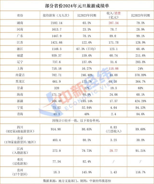 據(jù)中新經(jīng)緯不完全統(tǒng)計,截至1月3日21時,全國已有20省份發(fā)布2024年元旦旅游數(shù)據(jù)。其中,湖南接待游客2102.14萬人次,暫時領(lǐng)跑全國;河南接待游客1613.7萬人次,位列第二;廣東接待游客1447.9萬,排名第三。此外,江蘇、浙江兩省游客接待量也超過千萬。