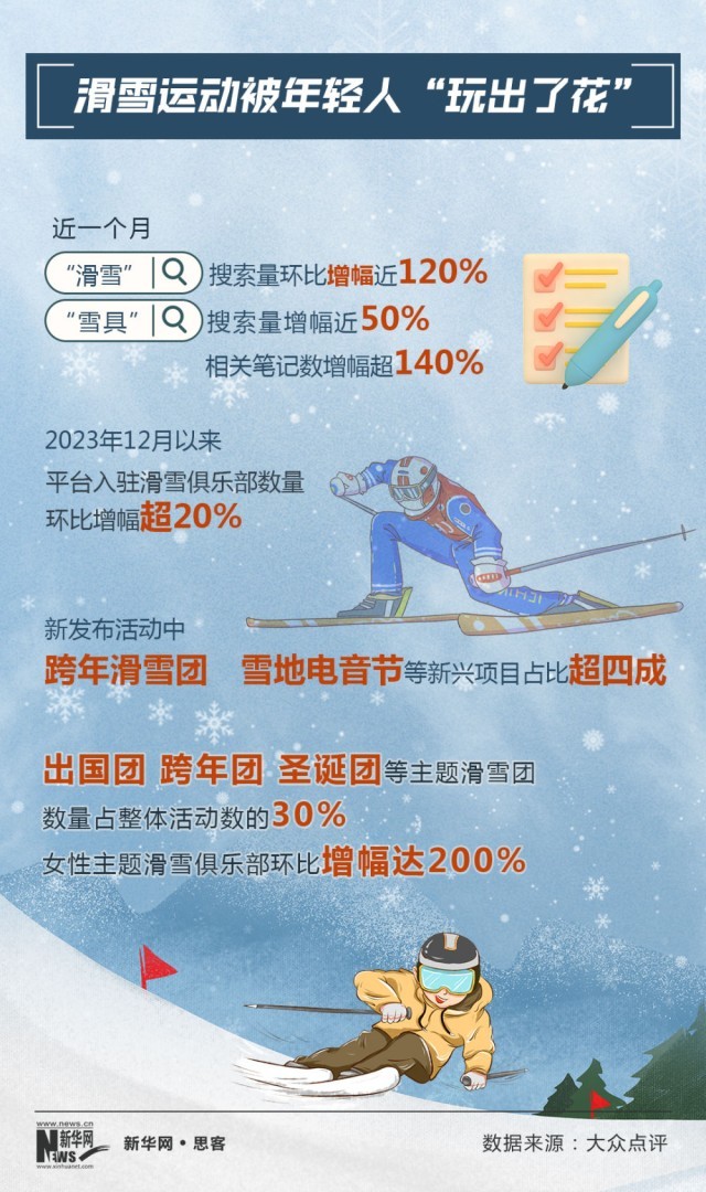 大眾點(diǎn)評數(shù)據(jù)顯示,2023年12月以來,滑雪俱樂部入駐數(shù)量環(huán)比增幅超20%。新發(fā)布活動中,雪地電音節(jié)、滑雪旅行團(tuán)等新興項目占比超四成?!盎彼阉髁凯h(huán)比增幅近120%,“雪具”搜索量增幅近50%,相關(guān)筆記數(shù)增幅超140%。很多“95后”網(wǎng)友表示,自己一直都想滑雪,在網(wǎng)絡(luò)上看到一些“滑雪+電音節(jié)”的筆記攻略,被這種新穎的形式吸引,立刻“種草”。