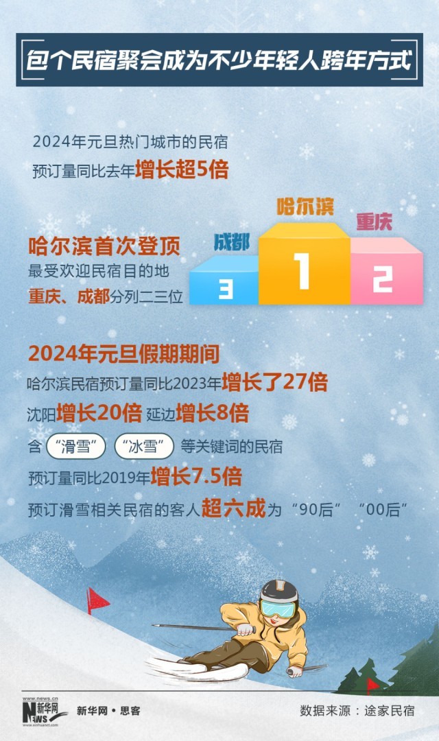 途家平臺數(shù)據(jù)顯示,元旦假期期間,哈爾濱民宿預(yù)訂量同比2023年增長了27倍,沈陽增長20倍,延邊增長8倍。含“滑雪”“冰雪”等關(guān)鍵詞的民宿,預(yù)訂量同比2019年增長7.5倍。預(yù)訂滑雪相關(guān)民宿的客人超六成為“90后”和“00后”。