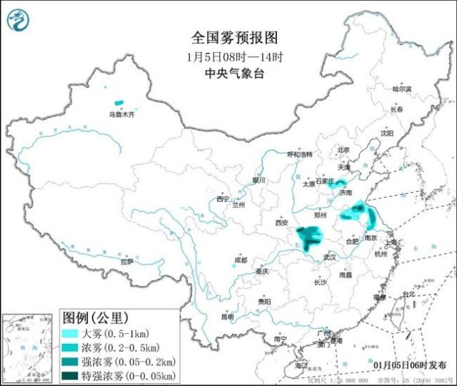 中央氣象臺1月5日06時繼續(xù)發(fā)布大霧黃色預警: