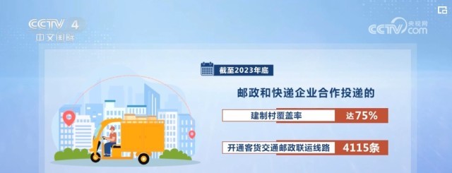 數(shù)據(jù)顯示,截至2023年底,中國郵政建成1061個縣、6010個鄉(xiāng)鎮(zhèn)的郵政處理中心和40萬個郵政及郵樂購村級站點,郵政和快遞企業(yè)合作投遞的建制村覆蓋率達(dá)75%,開通客貨交通郵政聯(lián)運線路4115條。