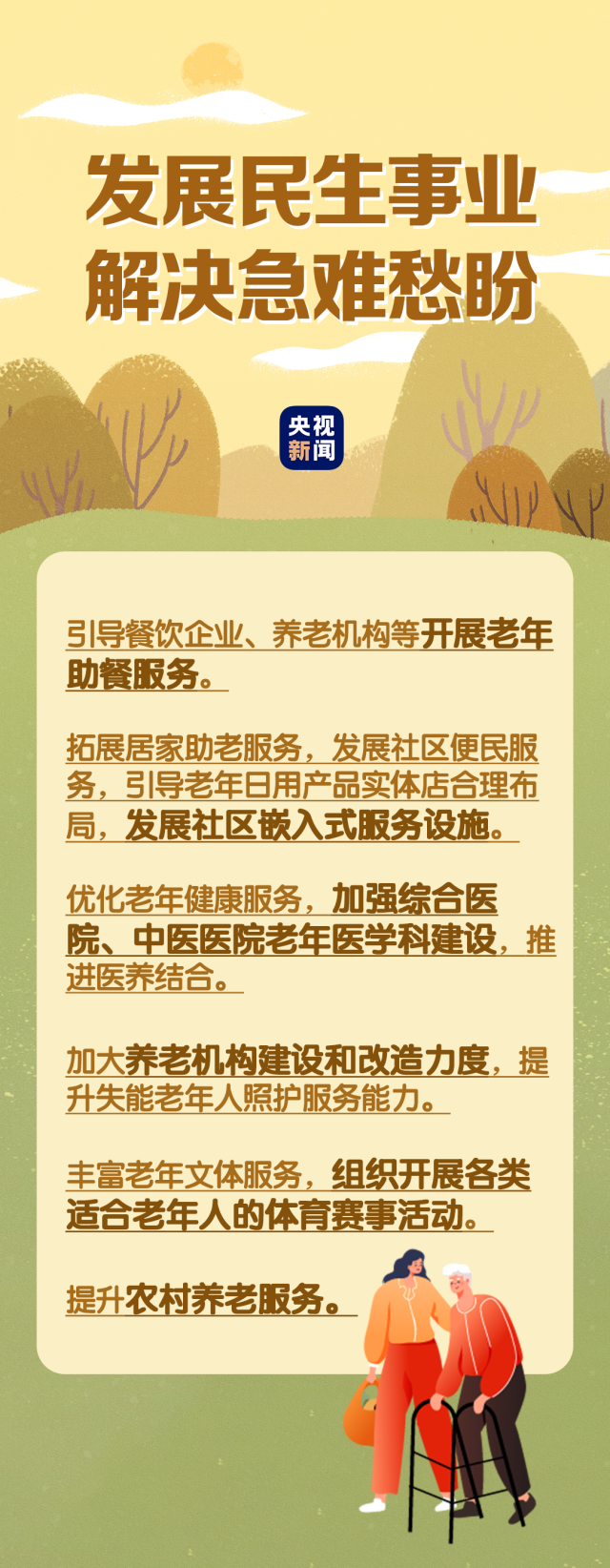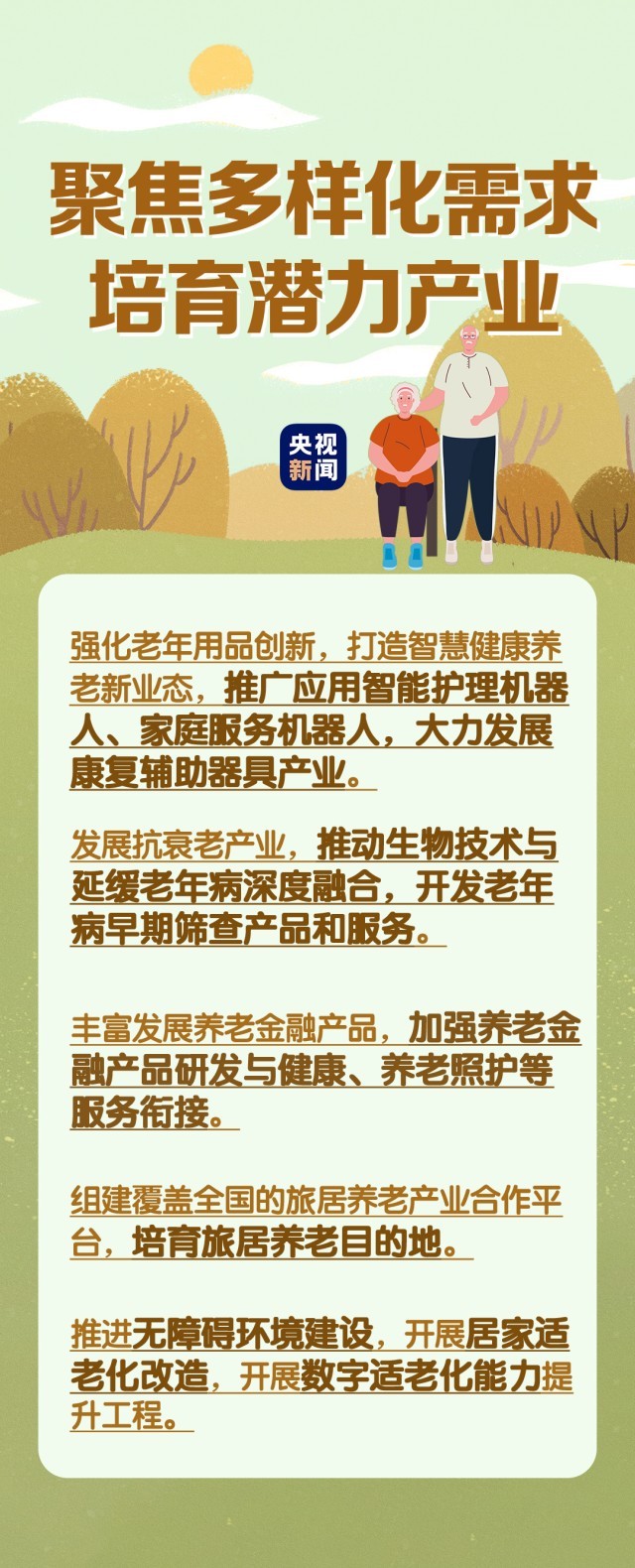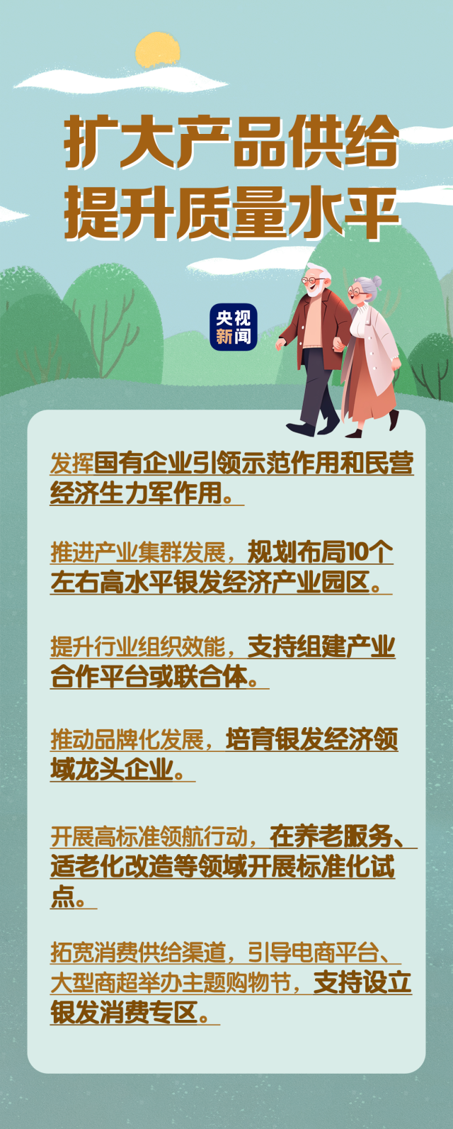 在民生事業(yè)方面,國家將擴(kuò)大和發(fā)展七方面的服務(wù),包括養(yǎng)老助餐、居家助老、社區(qū)便民、老年健康、養(yǎng)老照護(hù)、老年文體、農(nóng)村養(yǎng)老等方面的服務(wù)。國務(wù)院辦公廳印發(fā)《關(guān)于發(fā)展銀發(fā)經(jīng)濟(jì)增進(jìn)老年人福祉的意見》中提出了4個方面舉措,小編根據(jù)文件內(nèi)容進(jìn)行了簡要梳理,一圖了解“銀發(fā)經(jīng)濟(jì)”核心要點(diǎn)。↓↓↓