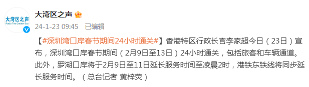香港特區(qū)行政長(zhǎng)官李家超:深圳灣口岸春節(jié)期間24小時(shí)通關(guān)