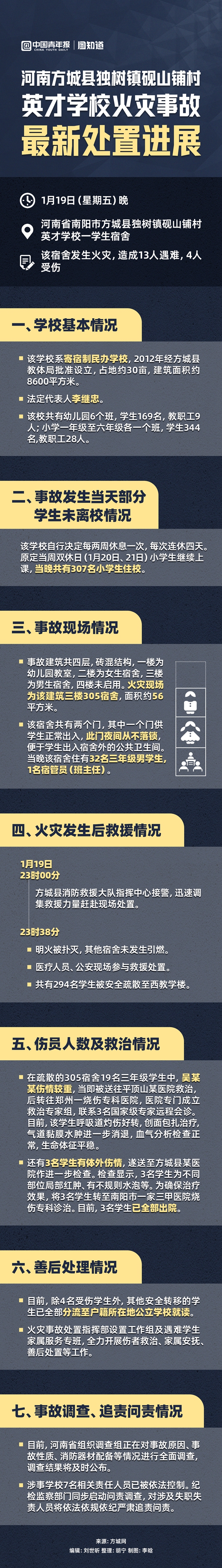 1月19日晚,河南省方城縣獨樹鎮(zhèn)硯山鋪村英才學校一宿舍發(fā)生火災,事故造成13人遇難,4人受傷。1月23日,方城縣通報了部分事故情況:當晚有307名小學生住校,火災現(xiàn)場為宿舍樓三樓305宿舍,面積56平方米;當晚該宿舍住有32名三年級男學生,1名宿管員(班主任);涉事學校7名相關(guān)責任人員已被依法控制。