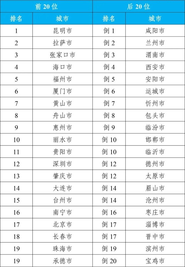 12月,168個重點城市中:空氣質量排名前20位城市依次是昆明、拉薩和張家口等城市(從第1名至并列第19名);空氣質量排名后20位城市依次是咸陽、蘭州和渭南等城市(從倒數第1名至倒數第20名)。見附表1。