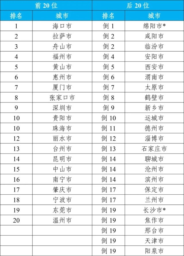 1—12月,168個重點城市中:空氣質量排名前20位城市依次是??凇⒗_和舟山等城市(從第1名至第20名);空氣質量排名后20位城市依次是綿陽、咸陽和臨汾等城市(從倒數第1名至并列倒數第19名)??諝赓|量變化排名前20位城市依次是漯河、駐馬店和鶴壁等城市(從第1名至并列第20名);空氣質量變化排名后20位城市依次是綿陽、長沙和南充等城市(從倒數第1名至倒數第20名)。其中,綿陽市科技城新區(qū)的高新區(qū)自來水公司站點4月和5月、長沙市開福區(qū)的伍家?guī)X站點6月受到嚴重人為干擾,對所在城市當月六項污染物濃度進行了最大值替代處理。見附表2、3。