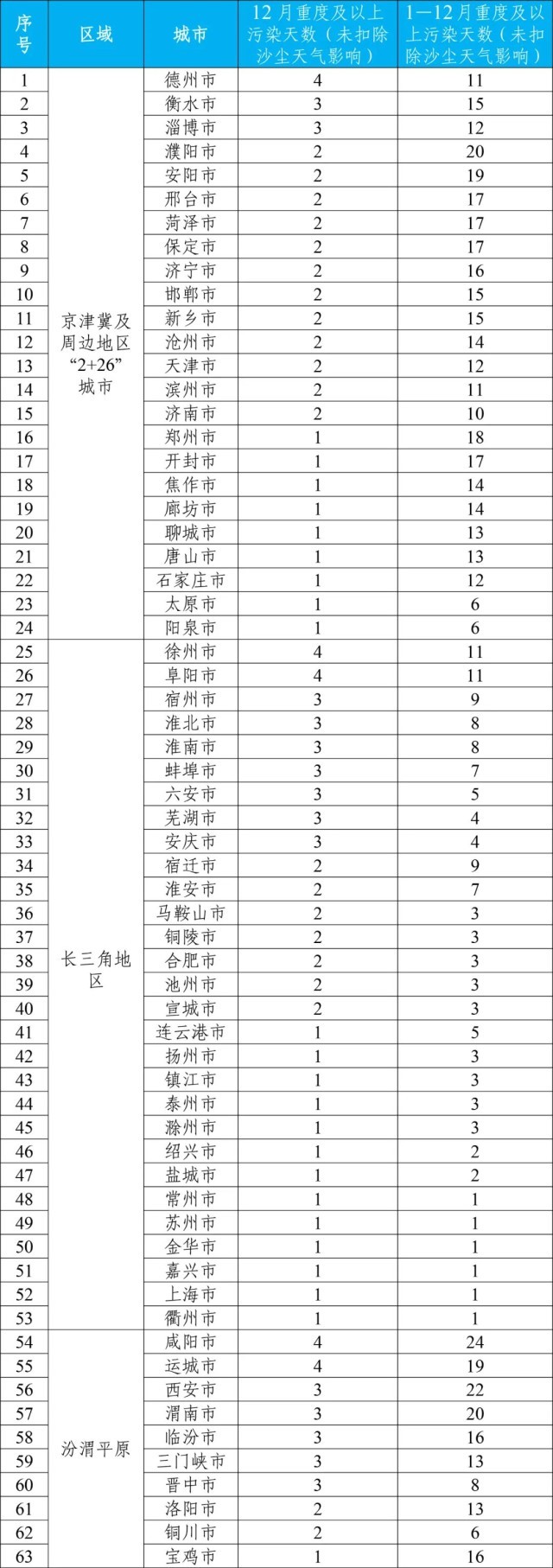 12月和1—12月重點區(qū)域出現重度及以上污染天的城市及具體天數詳見附表4。