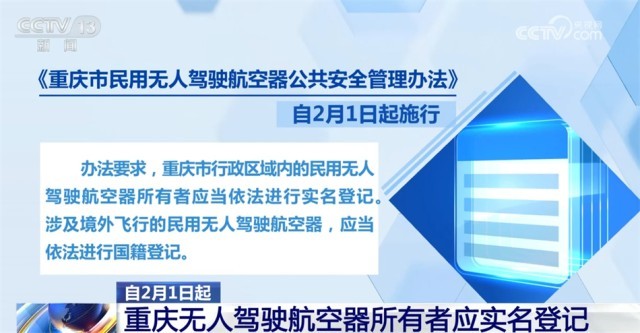 《重慶市民用無人駕駛航空器公共安全管理辦法》自2月1日起施行。辦法要求,重慶市行政區(qū)域內(nèi)的民用無人駕駛航空器所有者應(yīng)當依法進行實名登記。涉及境外飛行的民用無人駕駛航空器,應(yīng)當依法進行國籍登記。