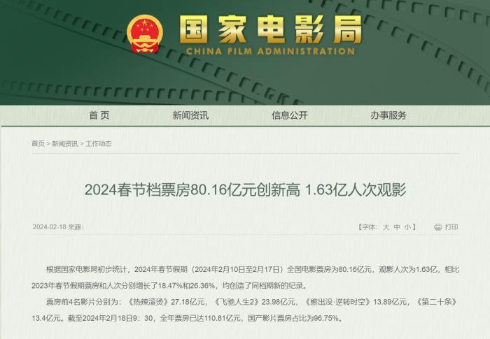 - 2024年春節(jié)檔前四名影片累計(jì)票房破100億