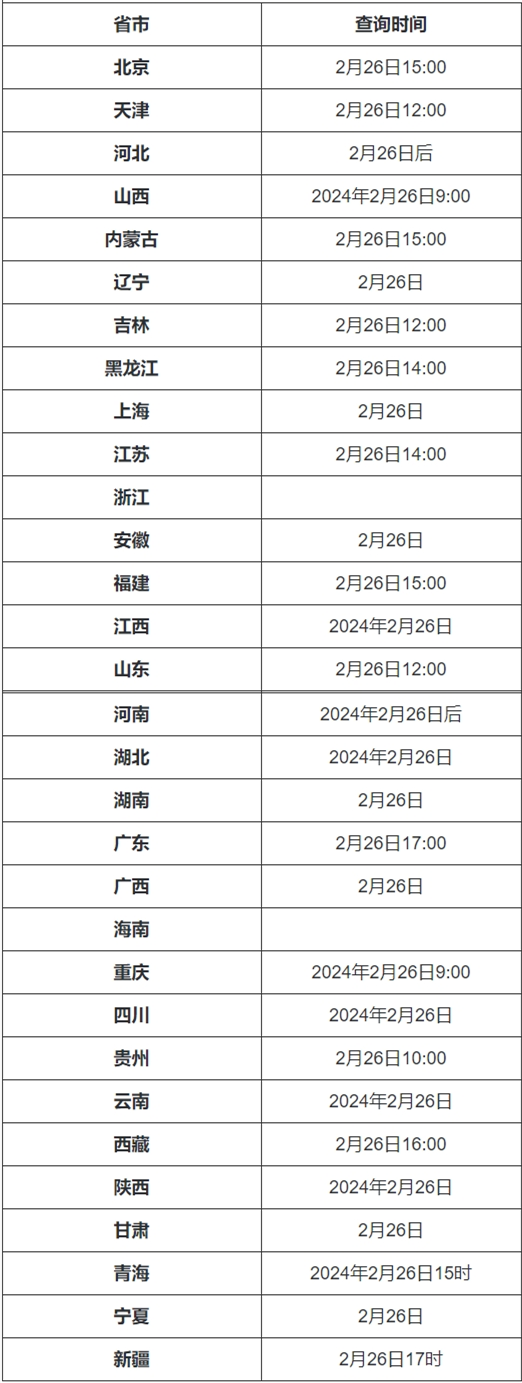 山西、重慶考生可于26日9時(shí)起查詢(xún);天津、吉林、山東考生可在26日12時(shí)起查詢(xún);黑龍江、江蘇考生可以在26日14時(shí)起查詢(xún);北京、福建、青海、內(nèi)蒙古考生可于26日15時(shí)起查詢(xún);廣東、新疆考生可于26日17時(shí)起查詢(xún)。詳見(jiàn)>>2024研考初試成績(jī)查詢(xún)時(shí)間匯總