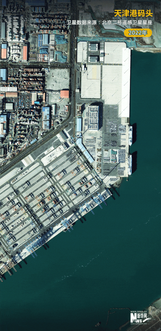 數據顯示,天津港2023年完成集裝箱吞吐量2217萬標準箱,同比增長5.5%,創(chuàng)歷史新高。衛(wèi)星見證,一批批待出口的貨物排列在天津港的碼頭上。我國外貿出口的火熱場景躍然圖上。