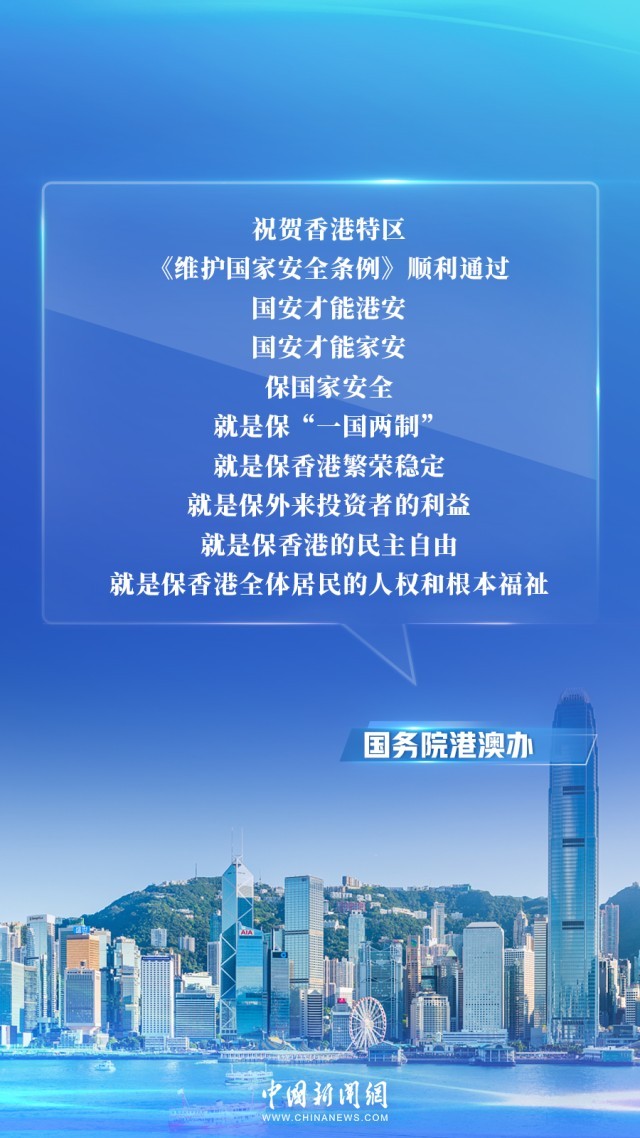 國務(wù)院港澳辦強調(diào),香港國安條例順利通過,為保持香港長期繁榮穩(wěn)定、推動“一國兩制”實踐行穩(wěn)致遠提供更加堅實的制度保障。香港國安條例全面有效維護國家安全,充分尊重和保障人權(quán),更好統(tǒng)籌發(fā)展和安全。
