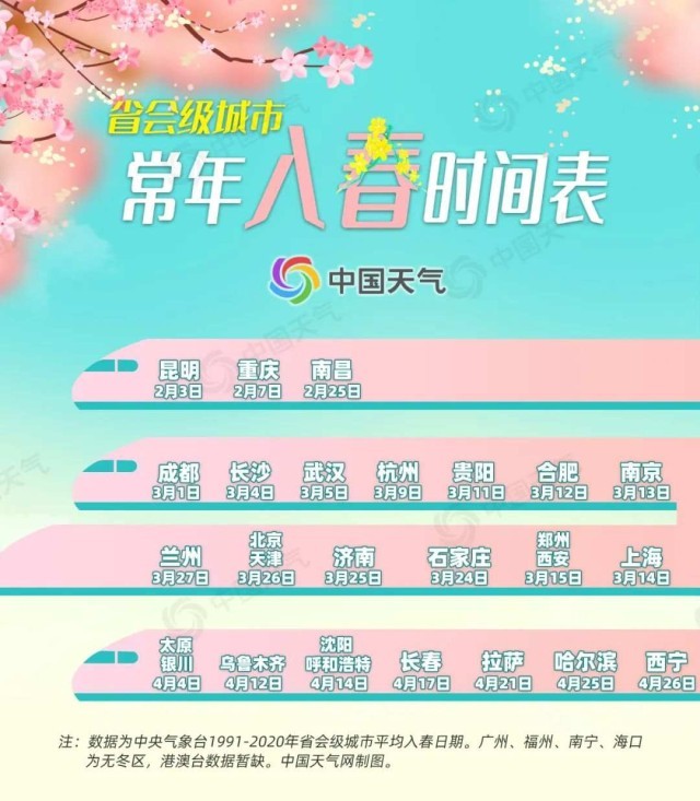 常年3月,是我國入春最集中的一段時間,此時往往有15個省會級城市完成冬春轉(zhuǎn)換。3月上旬,成都、長沙、武漢、杭州等地率先進入氣象學意義上的春天;3月中旬,貴陽、合肥、南京、上海、鄭州、西安等地邁入春天的門檻;3月下旬,華北、黃淮一帶的石家莊、濟南、北京、天津等地也投入春的懷抱。