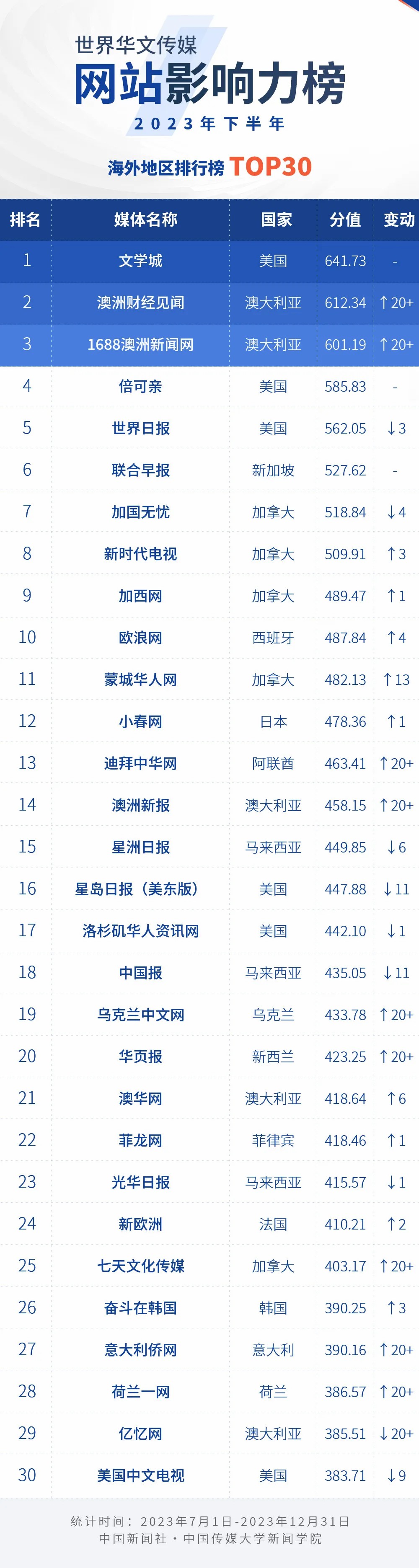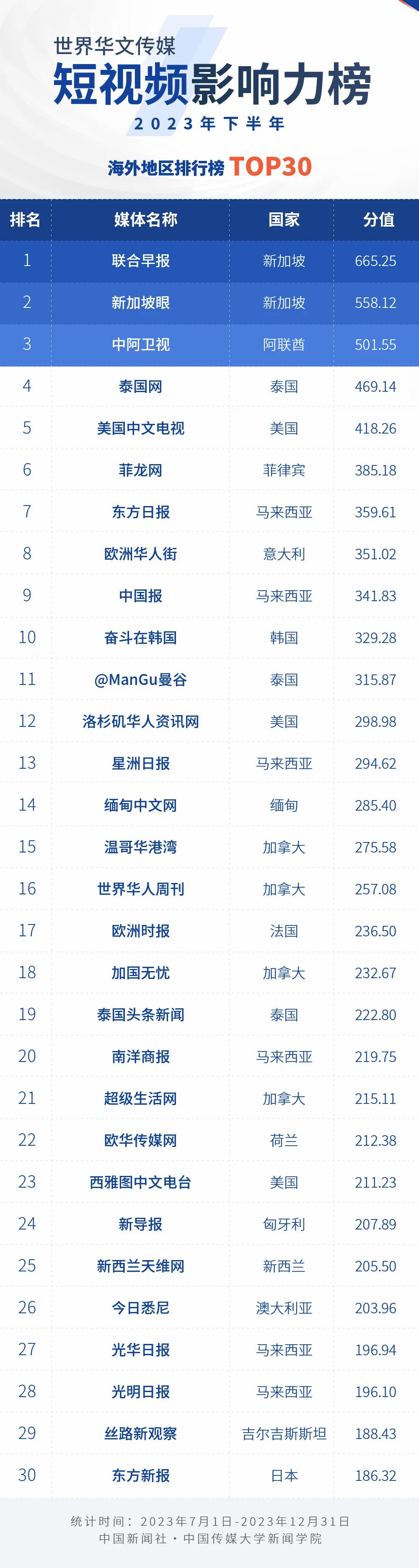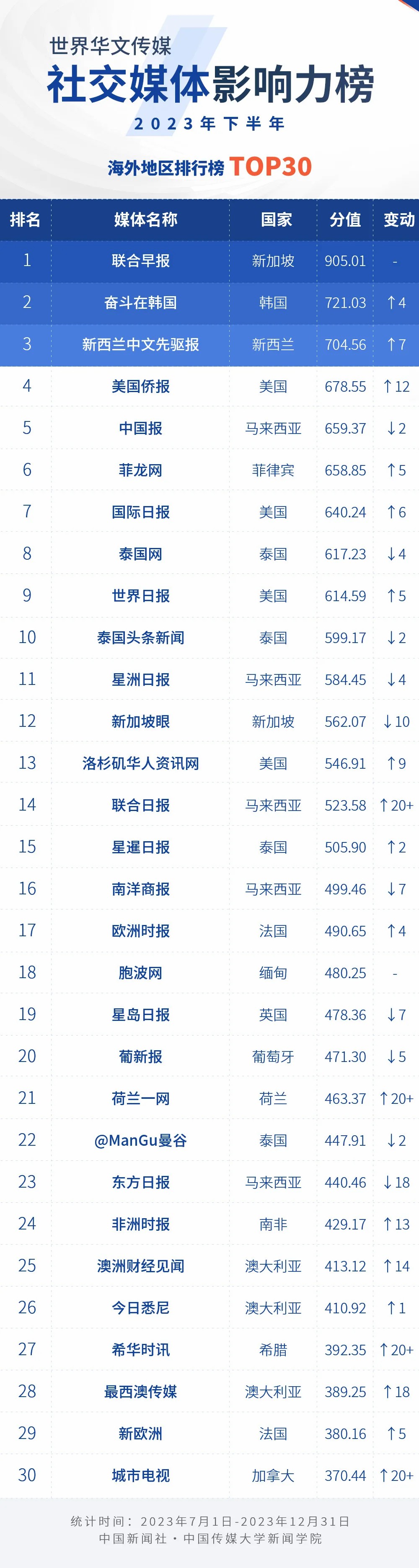 中國新聞社與中國傳媒大學(xué)新聞學(xué)院持續(xù)開展“世界華文傳媒新媒體影響力”測評項目,現(xiàn)根據(jù)2023年下半年世界華文傳媒新媒體的業(yè)務(wù)數(shù)據(jù),發(fā)布2023年下半年榜。