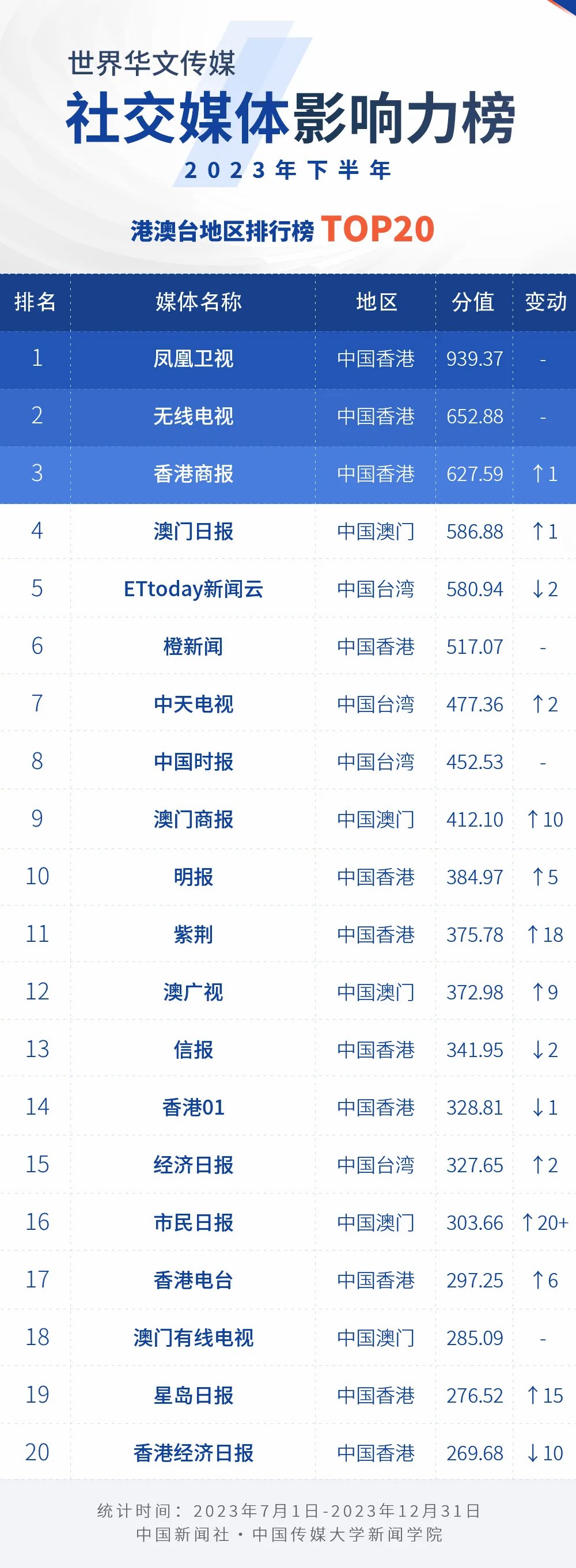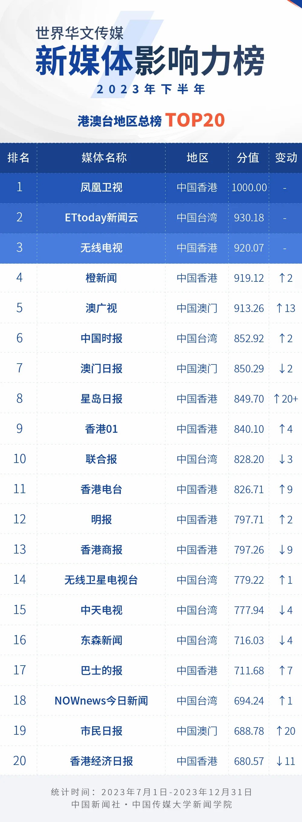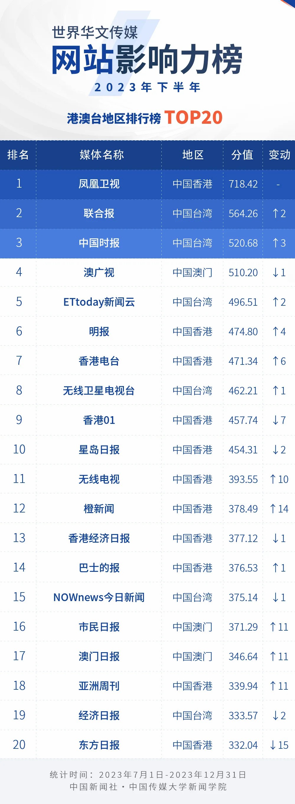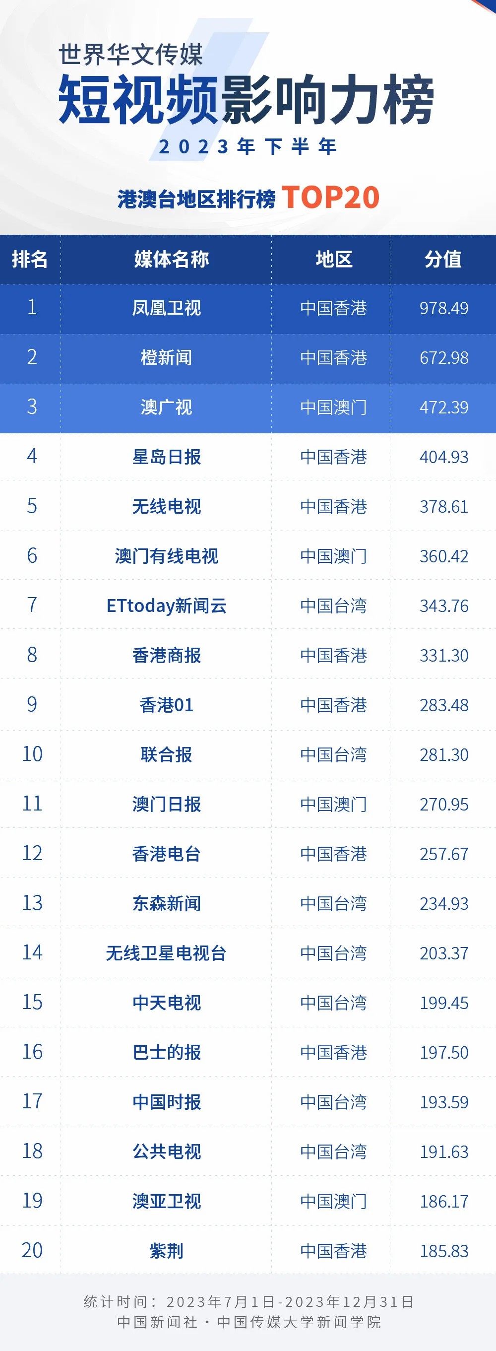 中國新聞社與中國傳媒大學(xué)新聞學(xué)院持續(xù)開展“世界華文傳媒新媒體影響力”測評項目,現(xiàn)根據(jù)2023年下半年世界華文傳媒新媒體的業(yè)務(wù)數(shù)據(jù),發(fā)布2023年下半年榜。