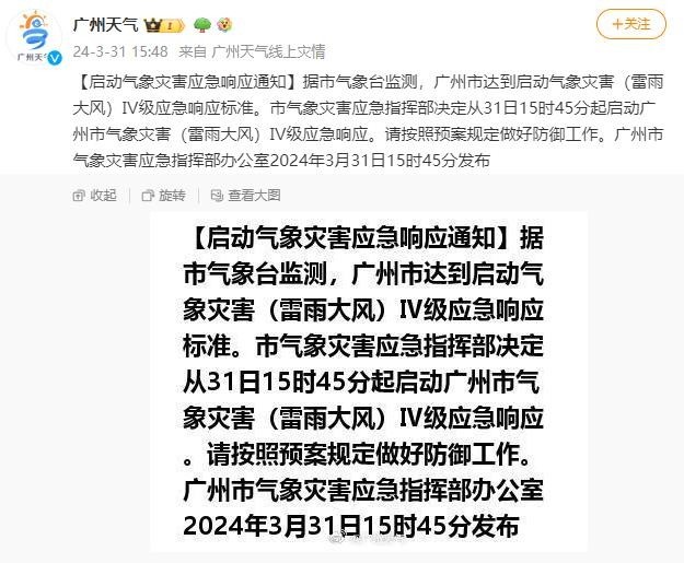 央視網(wǎng)消息:據(jù)廣州天氣 消息,據(jù)廣州市氣象臺監(jiān)測,廣州市達到啟動氣象災(zāi)害(雷雨大風(fēng))Ⅳ級應(yīng)急響應(yīng)標準。市氣象災(zāi)害應(yīng)急指揮部決定從31日15時45分起啟動廣州市氣象災(zāi)害(雷雨大風(fēng))Ⅳ級應(yīng)急響應(yīng)。請按照預(yù)案規(guī)定做好防御工作。