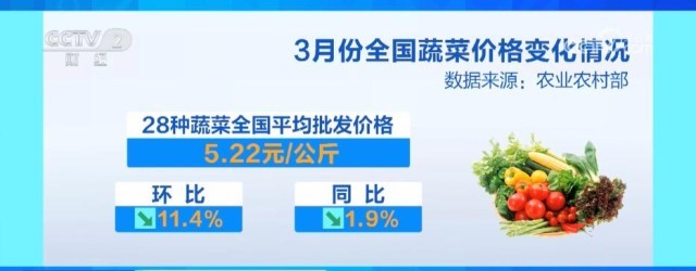 央視網(wǎng)消息:農(nóng)業(yè)農(nóng)村部發(fā)布的3月份全國(guó)“菜籃子”指數(shù)為126.44,環(huán)比下降9.47個(gè)點(diǎn),同比下降7.57個(gè)點(diǎn),其中蔬菜價(jià)格呈現(xiàn)季節(jié)性下降。