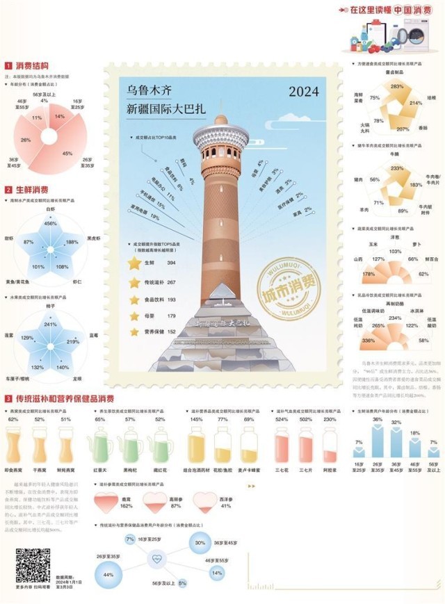 烏魯木齊從營(yíng)造放心消費(fèi)環(huán)境等方面切入,堅(jiān)持市場(chǎng)主導(dǎo),培育消費(fèi)新熱點(diǎn)。去年,烏魯木齊改造提升22個(gè)商圈,創(chuàng)建10個(gè)一刻鐘便民生活圈,推動(dòng)傳統(tǒng)商超向現(xiàn)代商業(yè)綜合體轉(zhuǎn)型升級(jí);結(jié)合地域特色,圍繞夜食、夜購(gòu)、夜娛、夜游、夜展等,發(fā)展夜間消費(fèi)新場(chǎng)景,有力帶動(dòng)了消費(fèi),2023年全市夜經(jīng)濟(jì)累計(jì)人流量達(dá)1.43億人次、消費(fèi)額90億元。